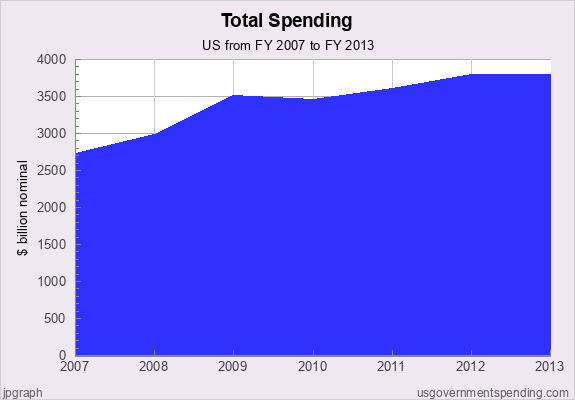 They went from spending ~ $2.7T in 2007 to ~ $3.8T in 2013. This was about a 41% INCREASE in spending, while the taxpayers are cutting costs & living within their means. Even with the govt 'shutdown', the govt is currently spending more than they did in 2007, while most of us are forced to spend a lot less.